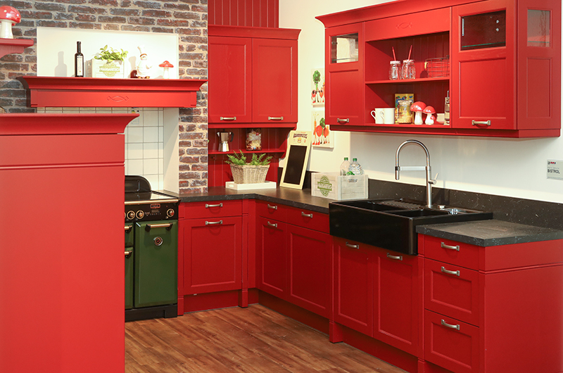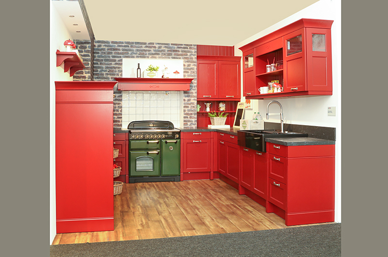 karminrot Esche lackiert, Rahmen massiv, Korpus 24 edelstahlfarben, APL/Nische 24 Marmor schwarz