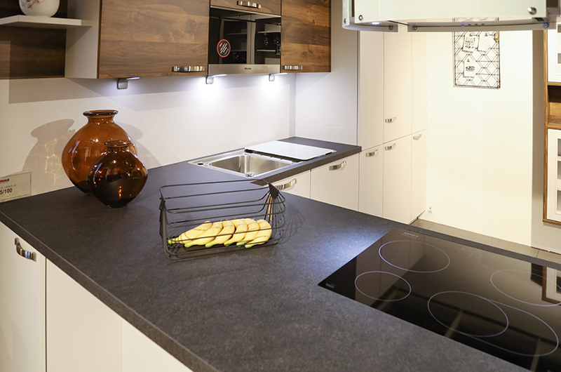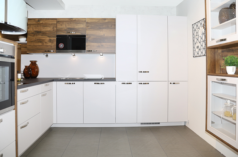 Front 417 weiß / 272 Balkeneiche NB, Korpus 070 Seidengrau, APL 371 Solid Granite NB