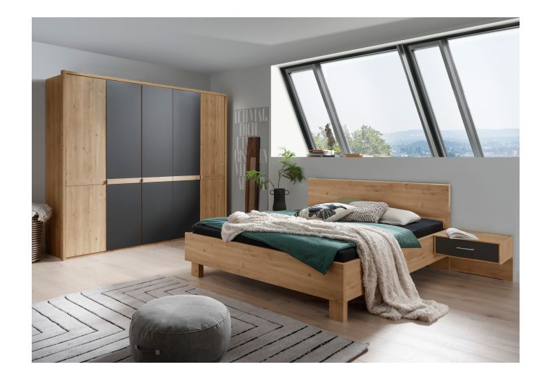 Korpus und Front Bianco-Eiche-Nachbildung, Front mit Querriegel, mittlere Türen Graphit-Dekor