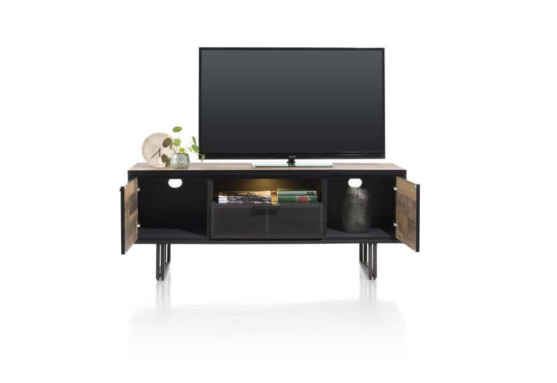Metall schwarz, Korpus Wiener Geflecht, Deckplatte ESG-Sicherheitsglas, 2 Türen, 2 offene Fächer