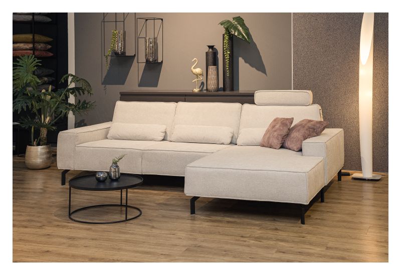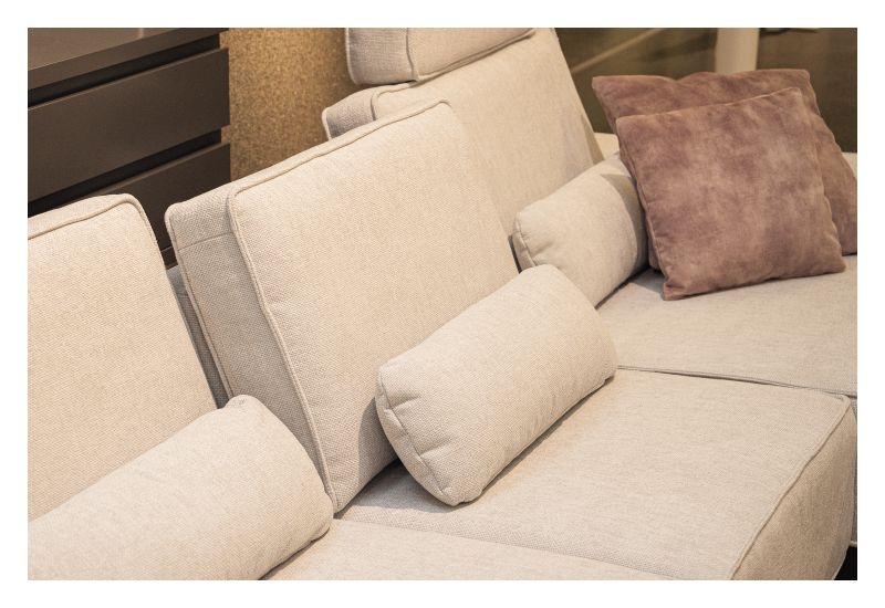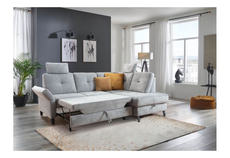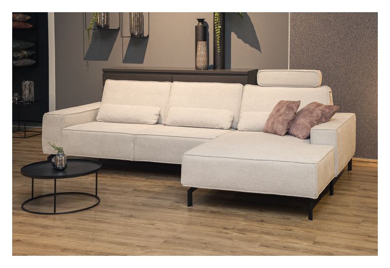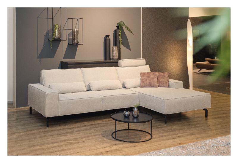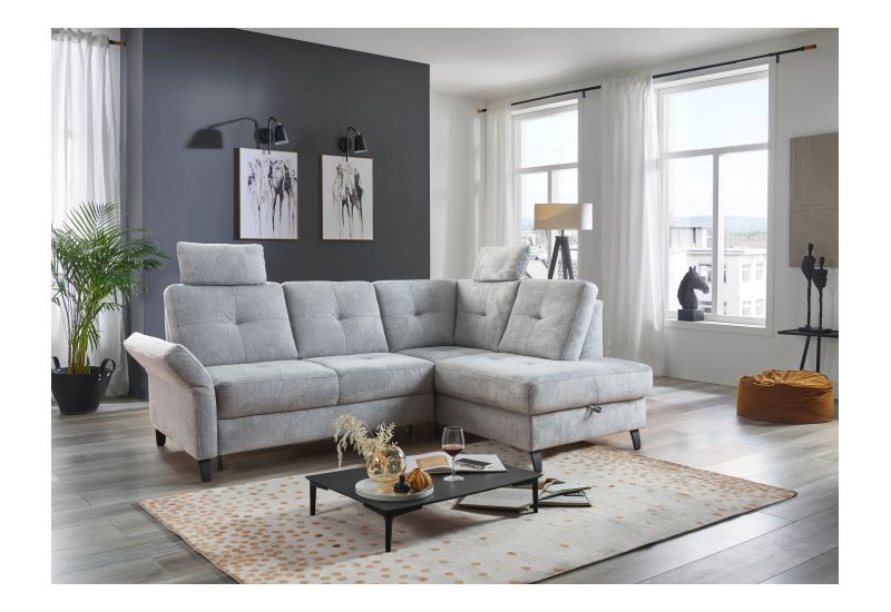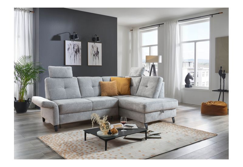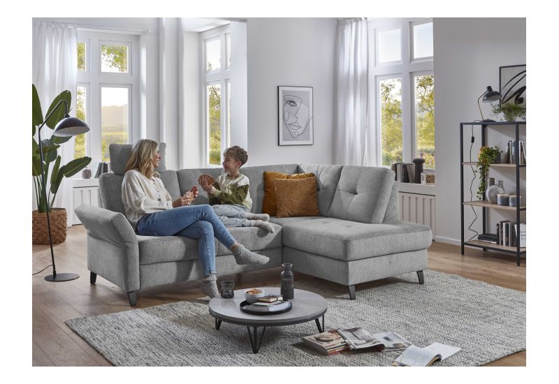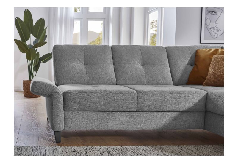 Bezug Orlean grau Sonderstoff, Rücken echt, Fuß Variante 3 schwarz matt, Kontrastnaht Ton in Ton, Sitz Federkern