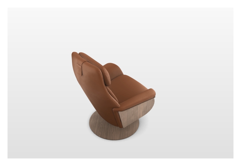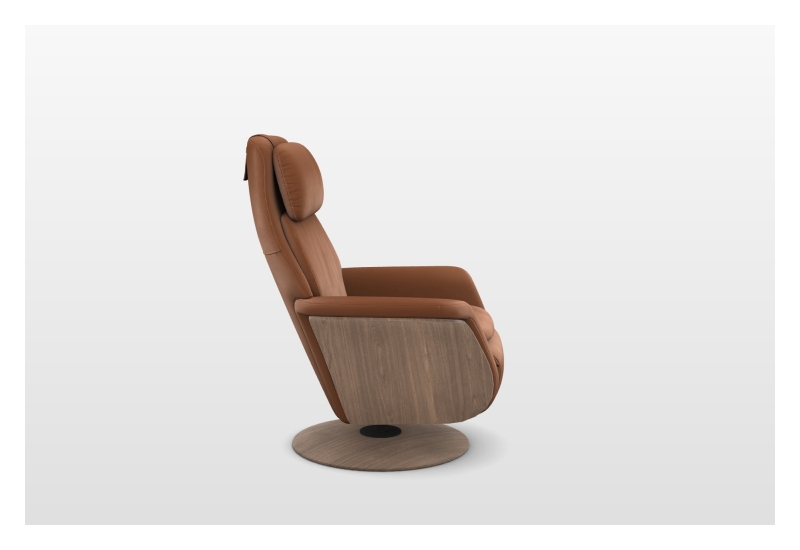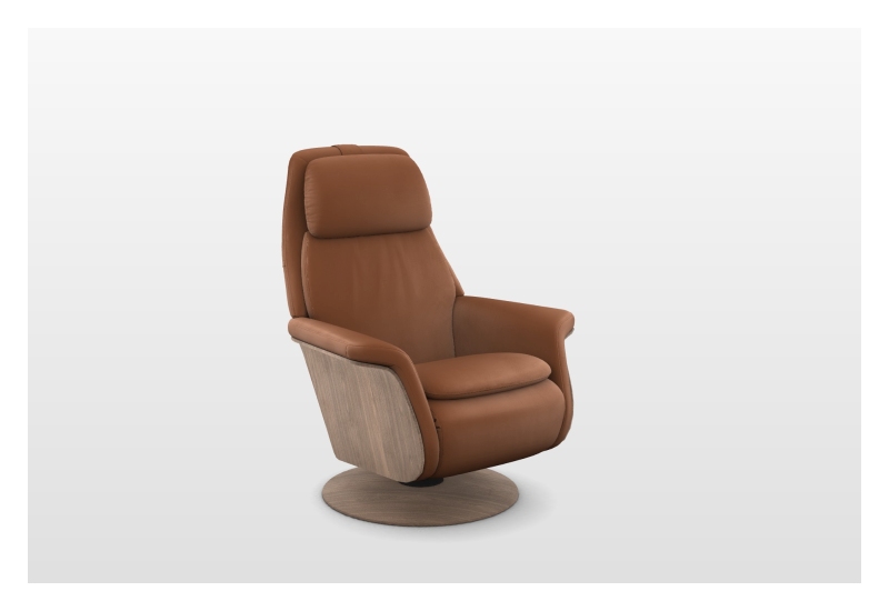 Leder Paloma 94 Cognac 41, Gestell + Drehteller Holz 35 Walnuss, motorische Verstellung Rückenlehne und Fußstütze