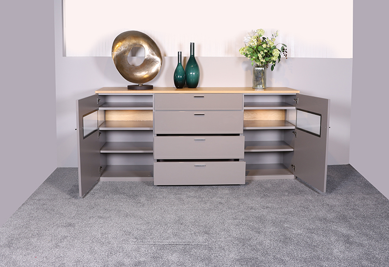 Lack taupe, Griff B7,, 2 Holztüren mit Glasausschnitt,, 4 Schubkästen